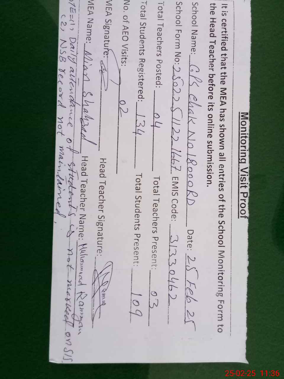 | Attendance Register | Head Teacher | MEA with School | Visit Proof |