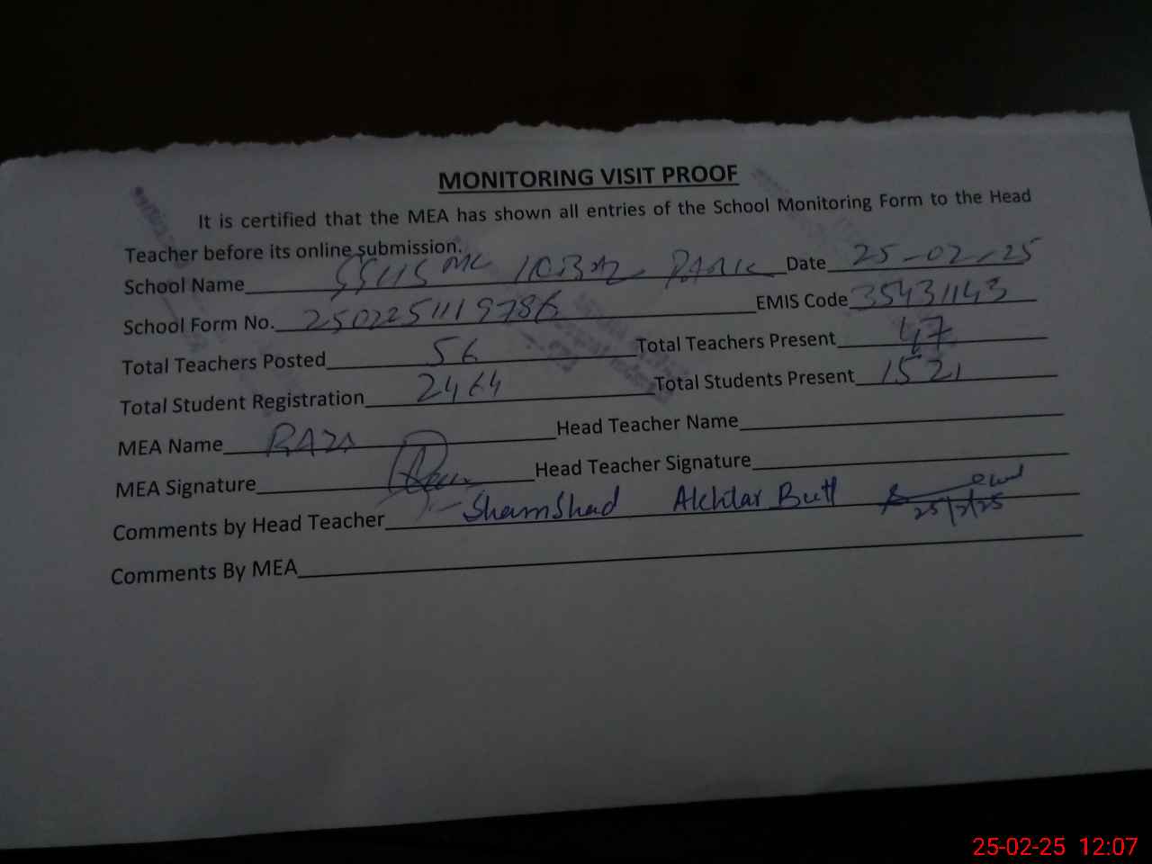 | Attendance Register | Head Teacher | MEA with School | Visit Proof |