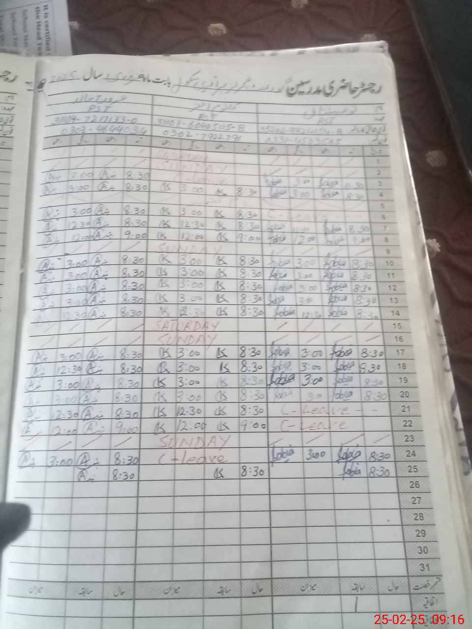 | CNIC | Full Name | Designation | R/C | Absence During Last Calender Month |