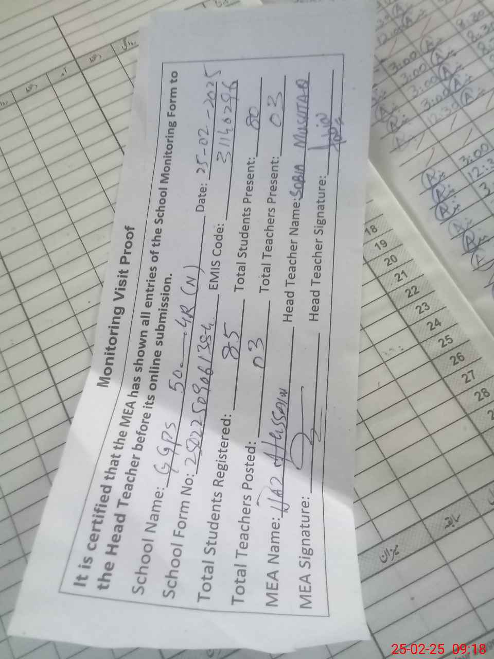 | Attendance Register | Head Teacher | MEA with School | Visit Proof |