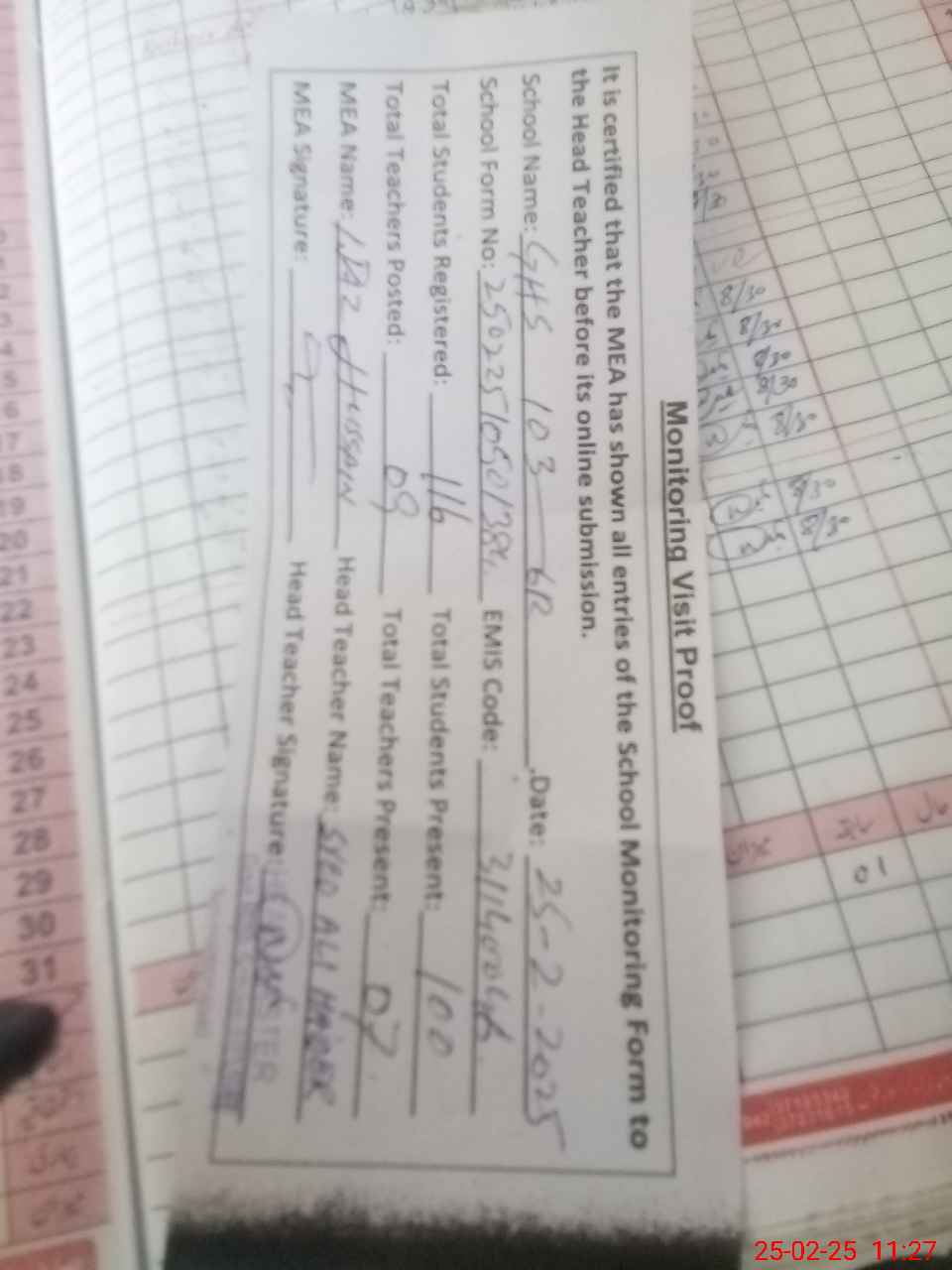| Attendance Register | Head Teacher | MEA with School | Visit Proof |