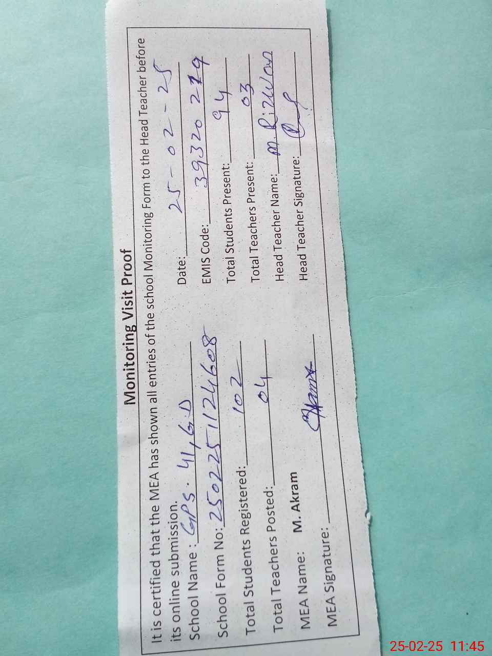 | Attendance Register | Head Teacher | MEA with School | Visit Proof |