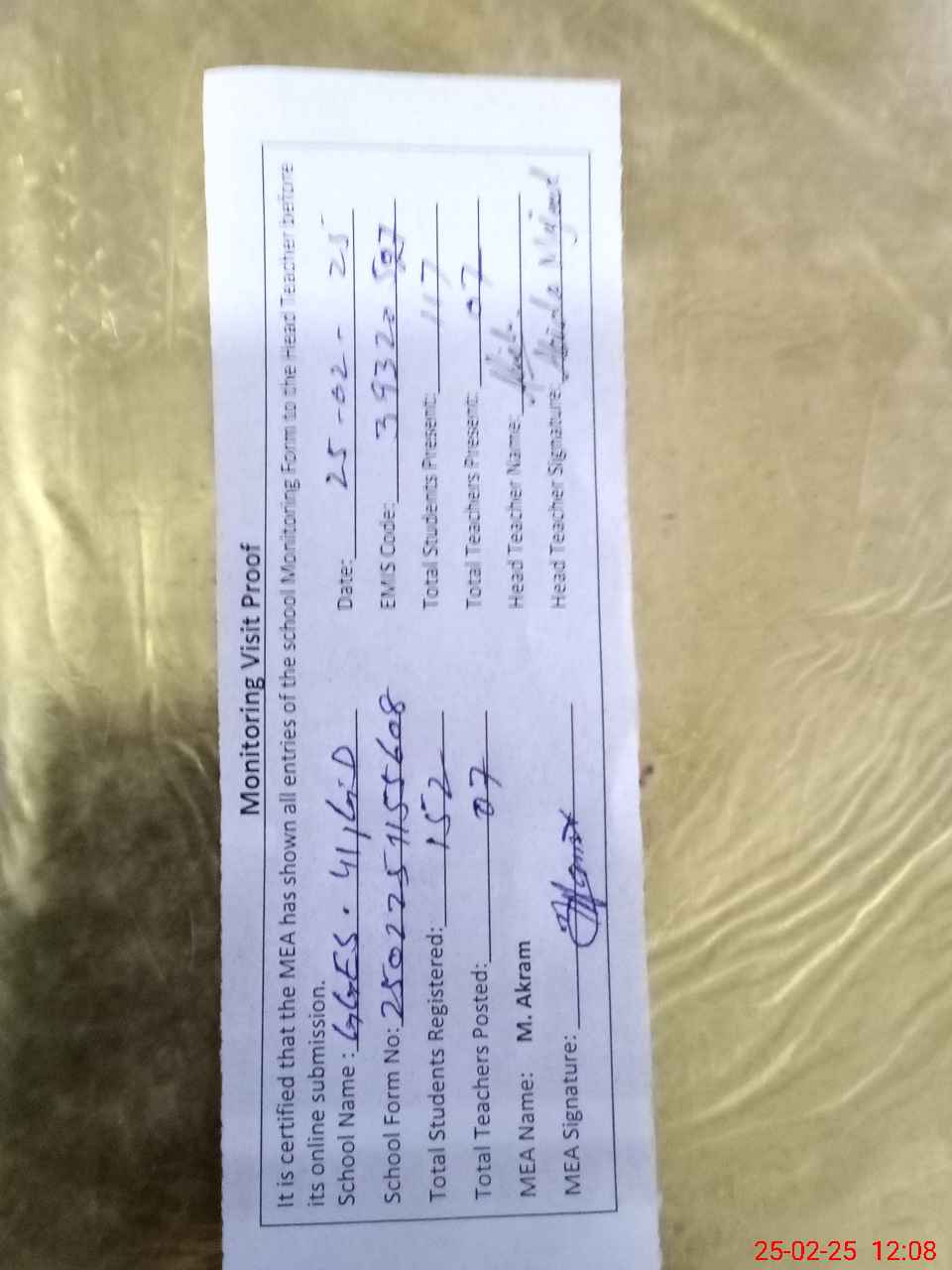 | Attendance Register | Head Teacher | MEA with School | Visit Proof |