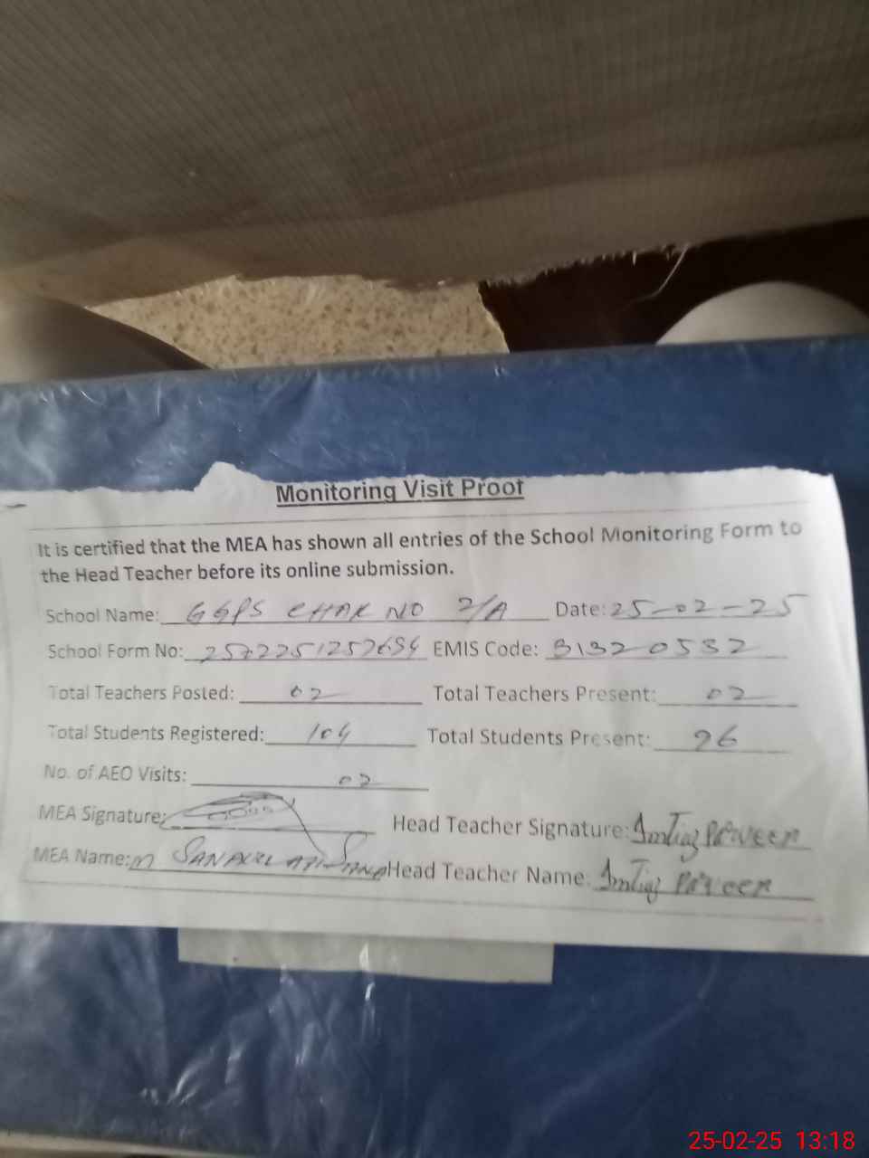 | Attendance Register | Head Teacher | MEA with School | Visit Proof |