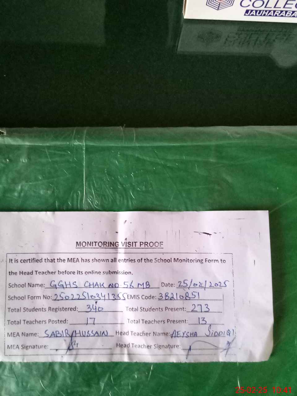 | EMIS Code: 38210851 | Name of School: GGHS CHAK NO. 56 MB | |||