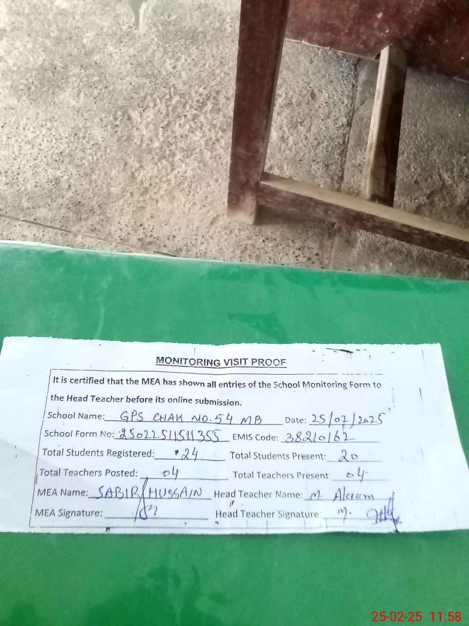 | Attendance Register | Head Teacher | MEA with School | Visit Proof |