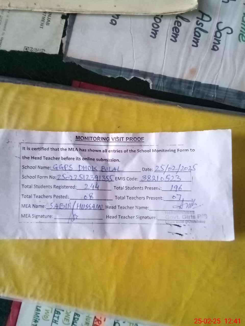 | Attendance Register | Head Teacher | MEA with School | Visit Proof |