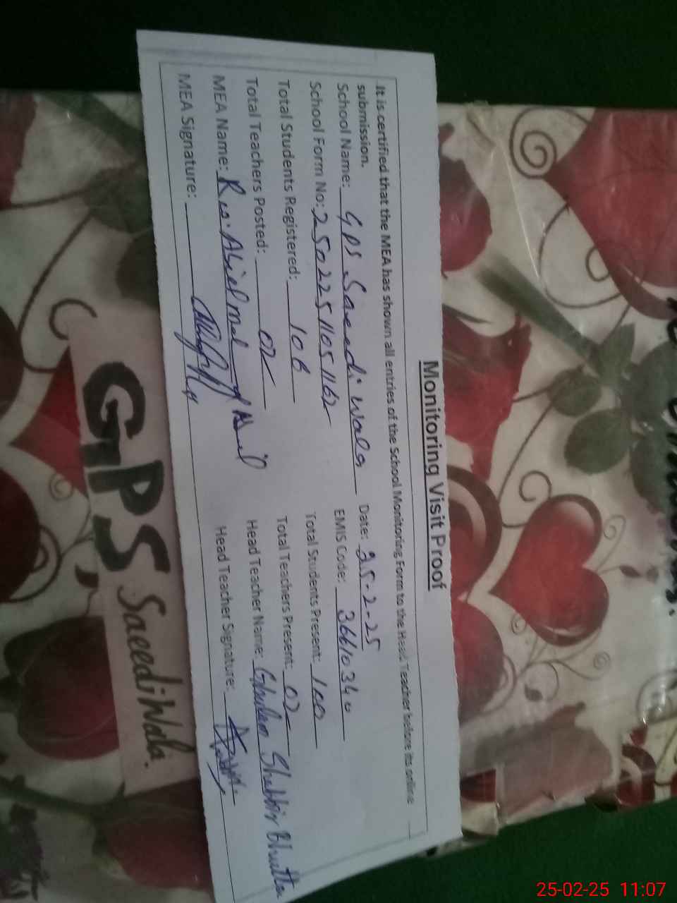 | EMIS Code: 36610340 | Name of School: GPS SAEEDI WALA | |||