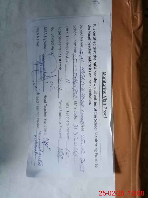 | Certified that this School was Inspected by the Undersigned MEA/DMO Today and the Information Stated Above is as Per Record. | |||||