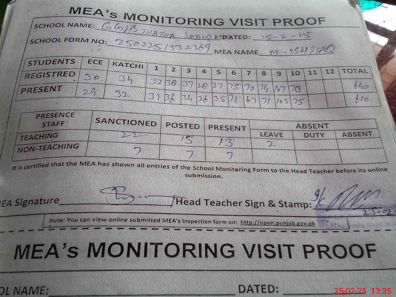 | Attendance Register | Head Teacher | MEA with School | Visit Proof |