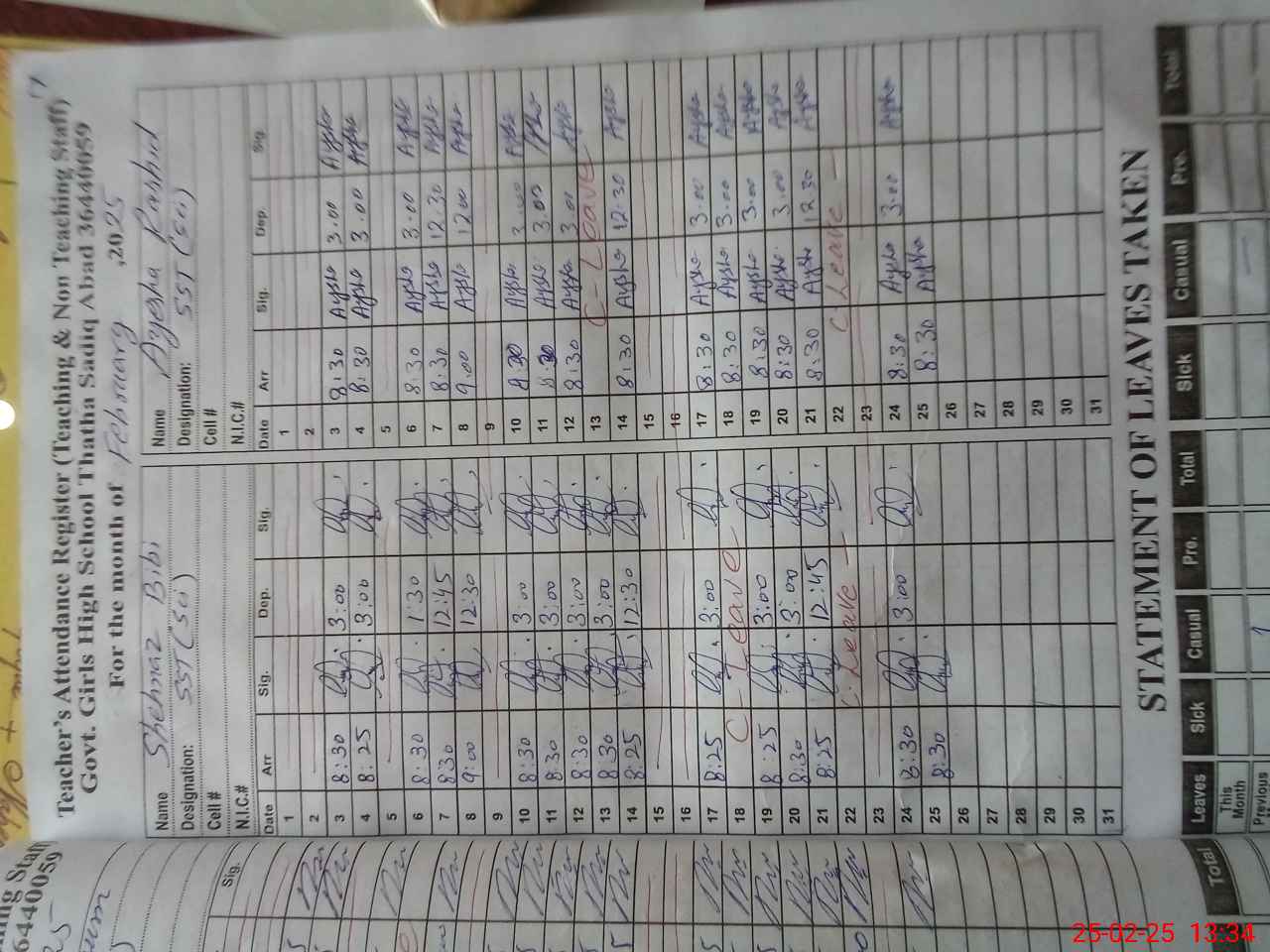 | CNIC | Full Name | Designation | R/C | Absence During Last Calender Month |