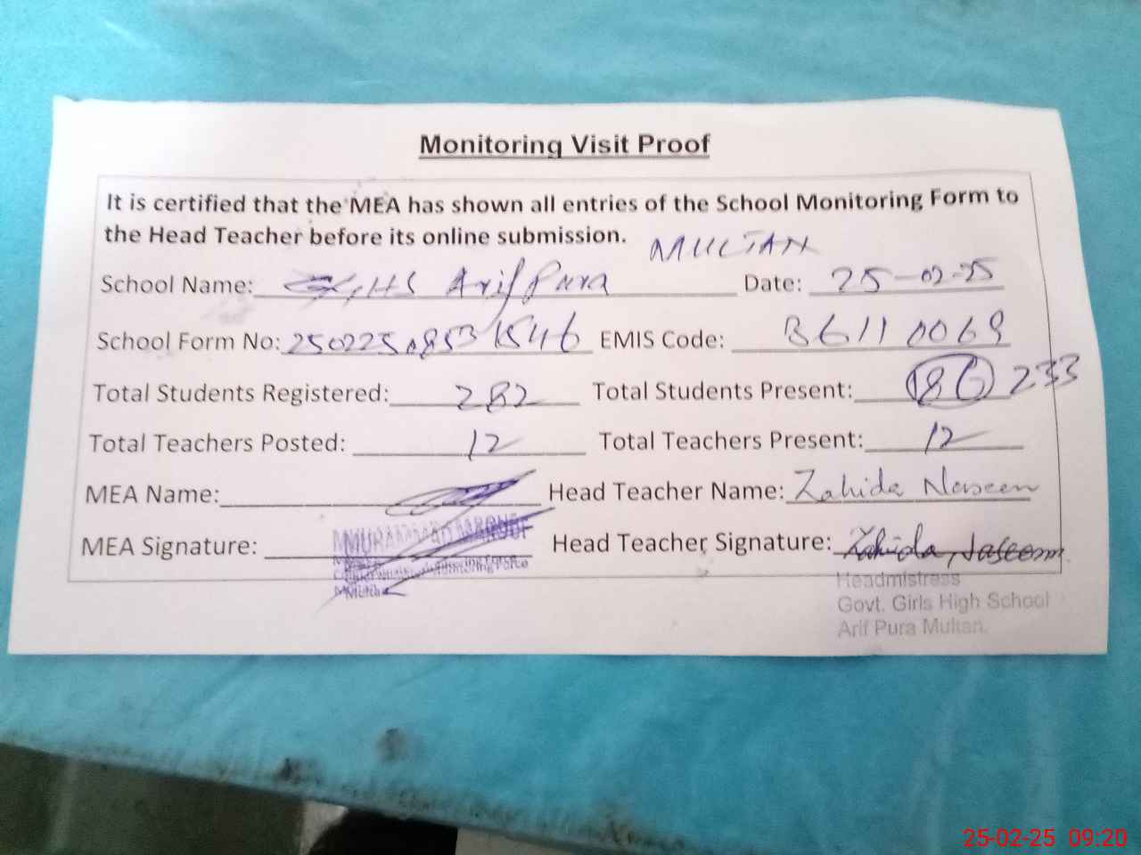 | Attendance Register | Head Teacher | MEA with School | Visit Proof |