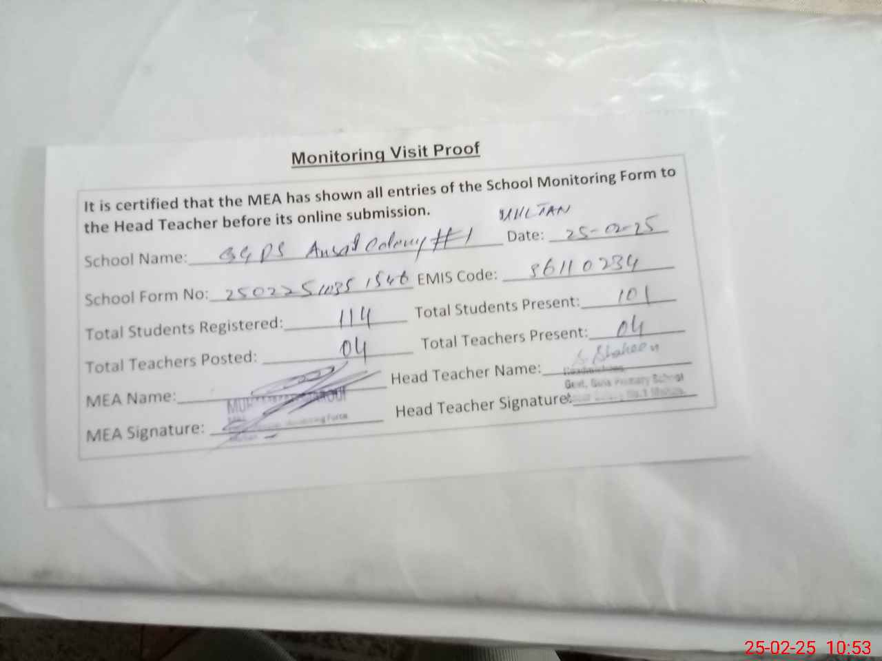 | Attendance Register | Head Teacher | MEA with School | Visit Proof |