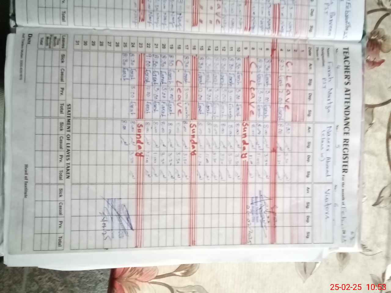 | CNIC | Full Name | Designation | R/C | Absence During Last Calender Month |