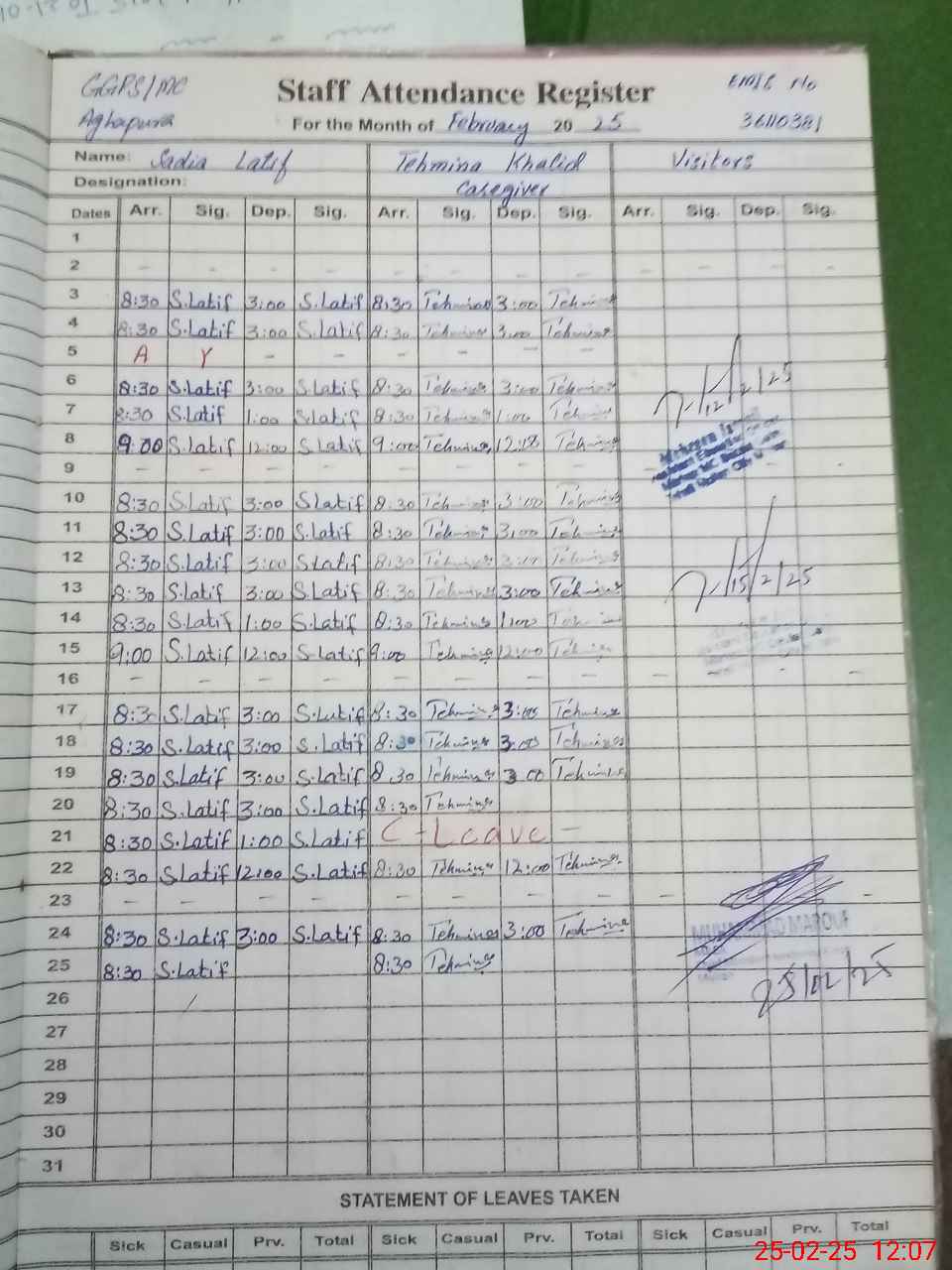 | CNIC | Full Name | Designation | R/C | Absence During Last Calender Month |