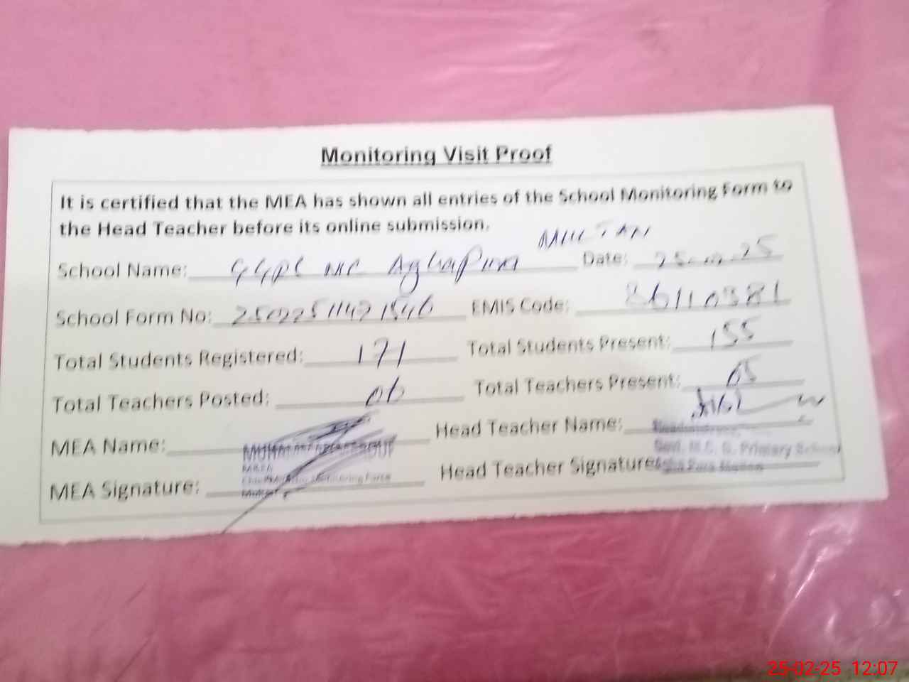 | Attendance Register | Head Teacher | MEA with School | Visit Proof |