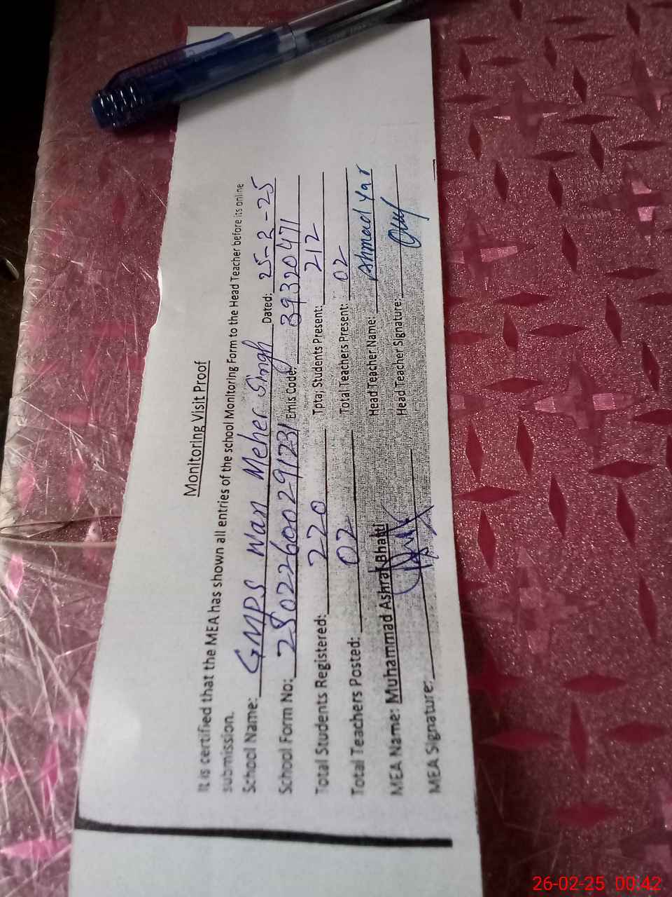 | EMIS Code: 39320471 | Name of School: GMPS WAN MEHR SINGH | |||