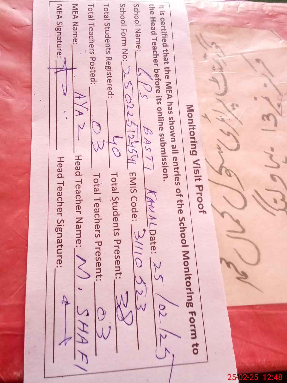 | Attendance Register | Head Teacher | MEA with School | Visit Proof |