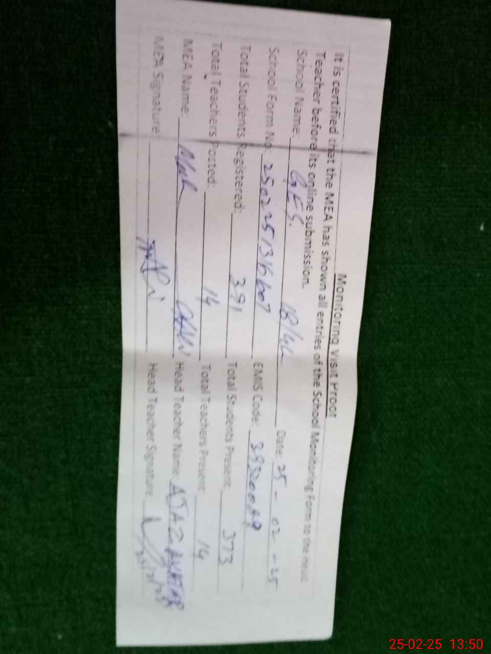 | Certified that this School was Inspected by the Undersigned MEA/DMO Today and the Information Stated Above is as Per Record. | |||||