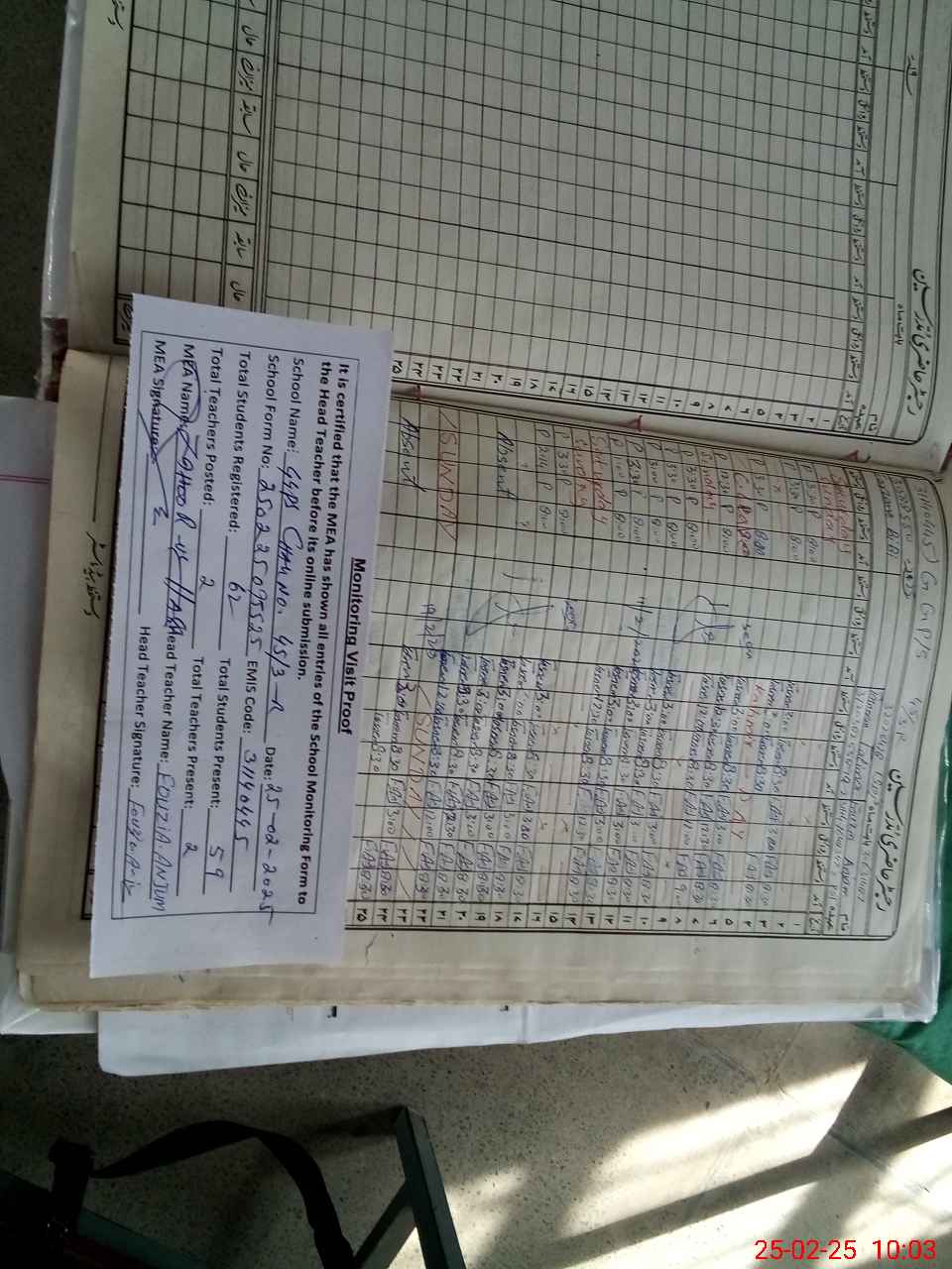 | Total no. of Classrooms: 3 No. of Classrooms Used for Teaching: 3 No. of Classrooms Storing Old Furniture, FTBs, etc: 0Comments if Any: C iv Farzana bi bi cnic no 3110405260932 has been Absenting himself without any record wef 19 Feb 2025 till to date |