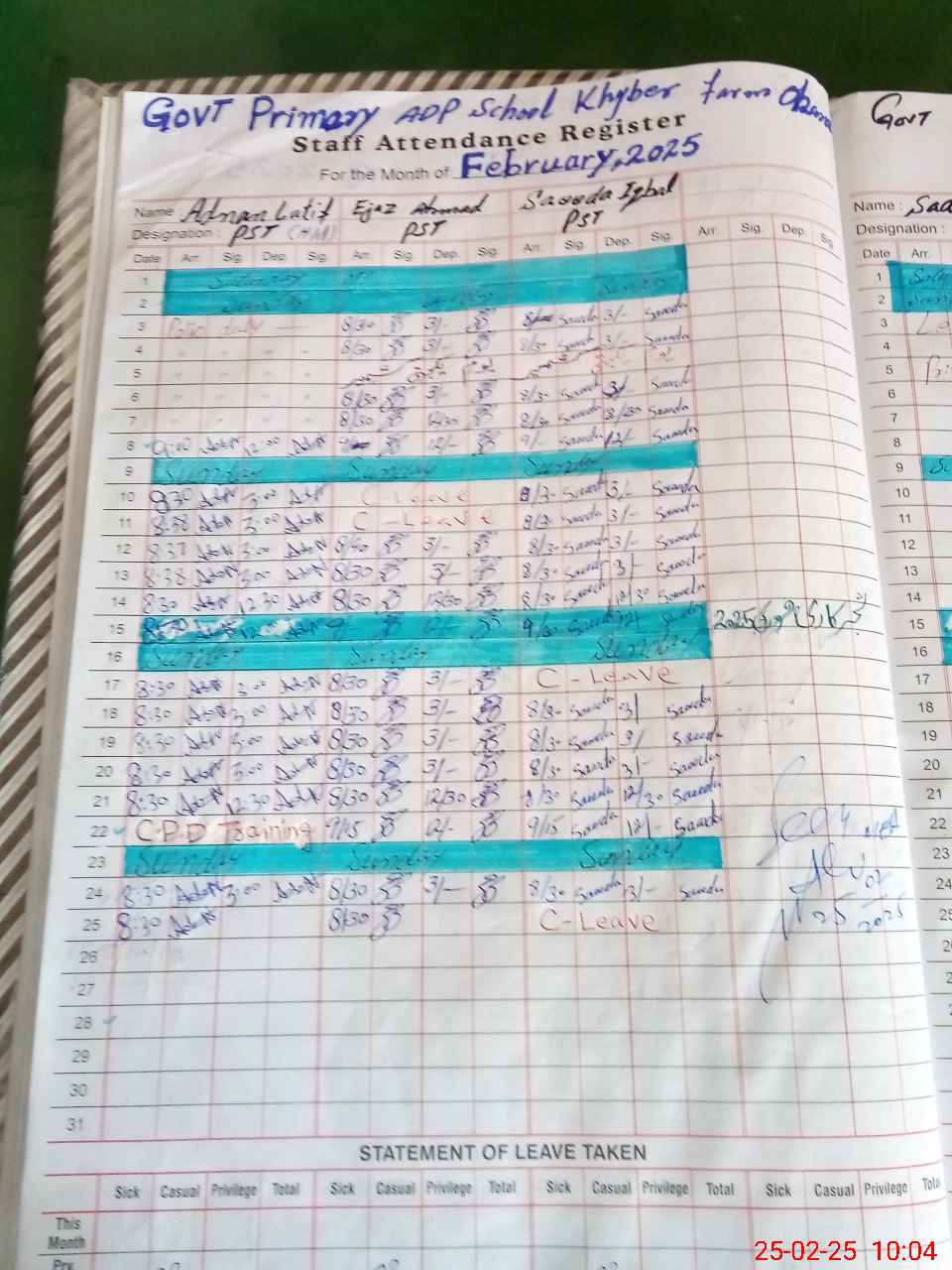 | Leave | Duty | Absent | Maternity | Medical | Ex- Pak |