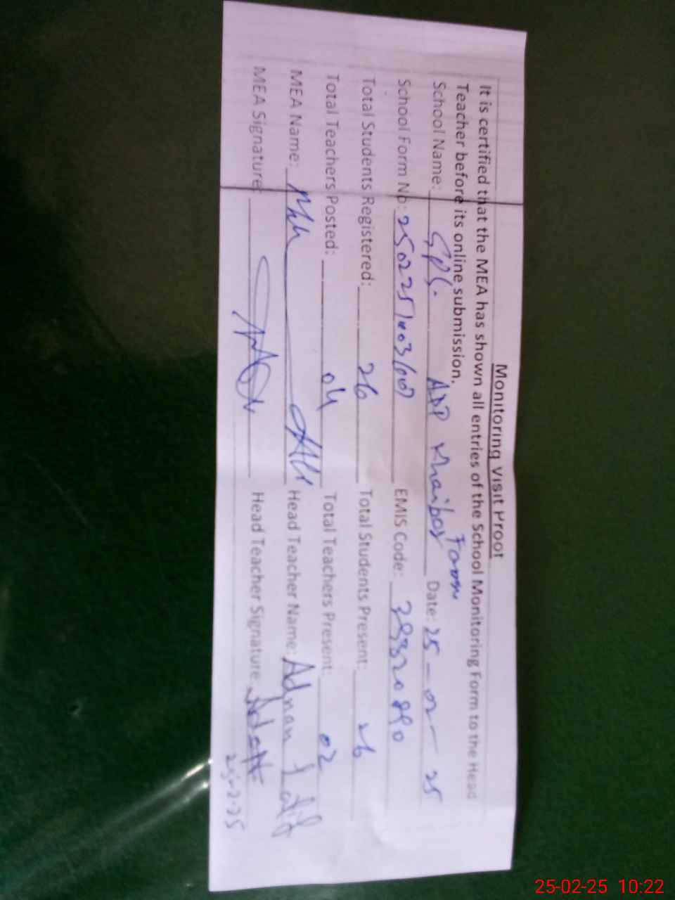 | Attendance Register | Head Teacher | MEA with School | Visit Proof |