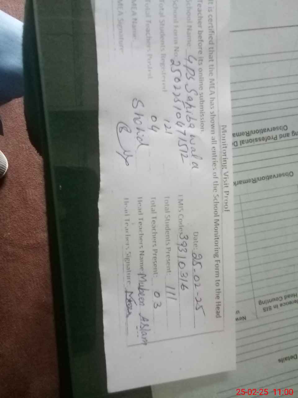 | Attendance Register | Head Teacher | MEA with School | Visit Proof |