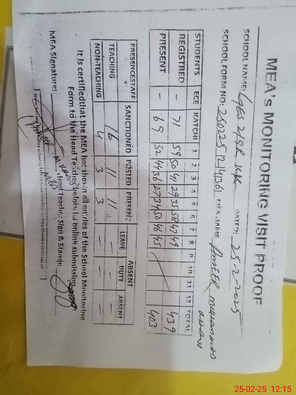 | Attendance Register | Head Teacher | MEA with School | Visit Proof |
