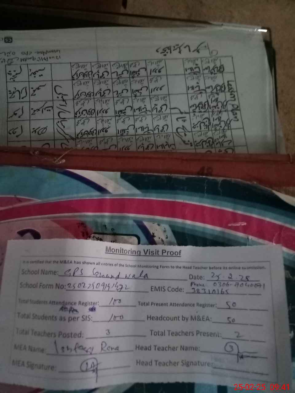 | Attendance Register | Head Teacher | MEA with School | Visit Proof |