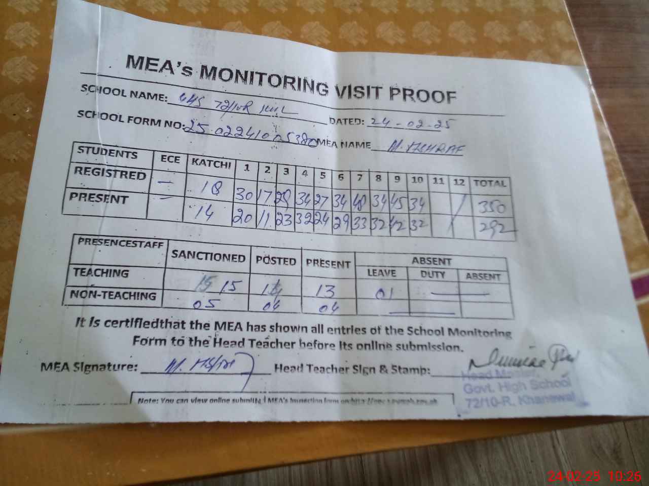 | EMIS Code: 36420016 | Name of School: GHS 72/10-R, SHANTI NAGAR, KHANEWAL | |||