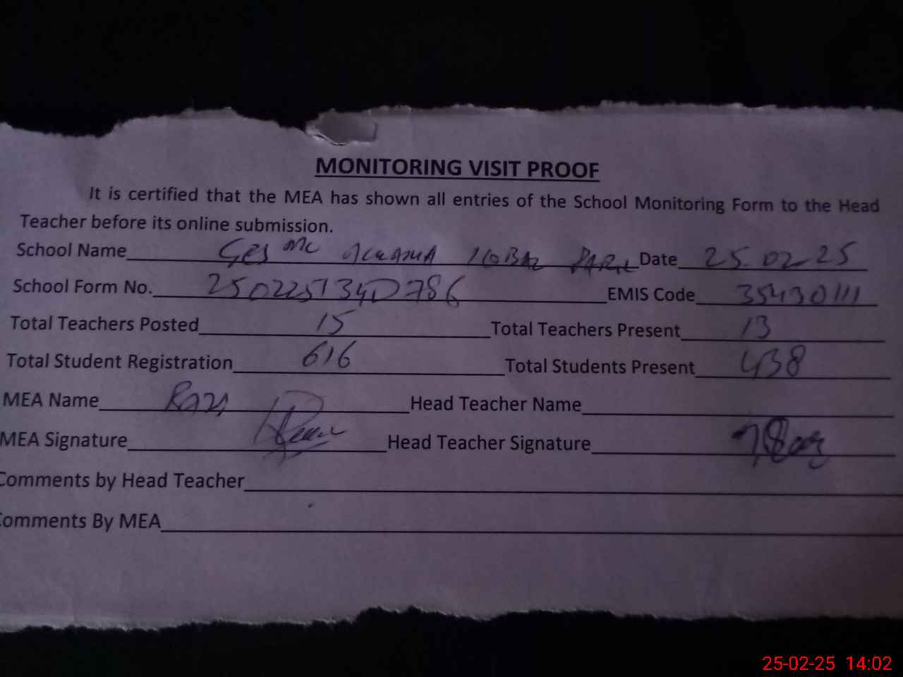 | Attendance Register | Head Teacher | MEA with School | Visit Proof |