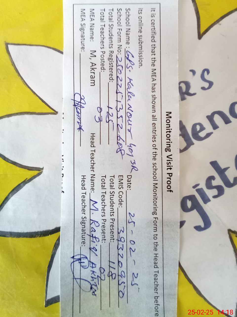 | Attendance Register | Head Teacher | MEA with School | Visit Proof |