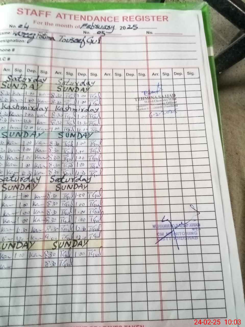 | CNIC | Full Name | Designation | R/C | Absence during last cal. month |