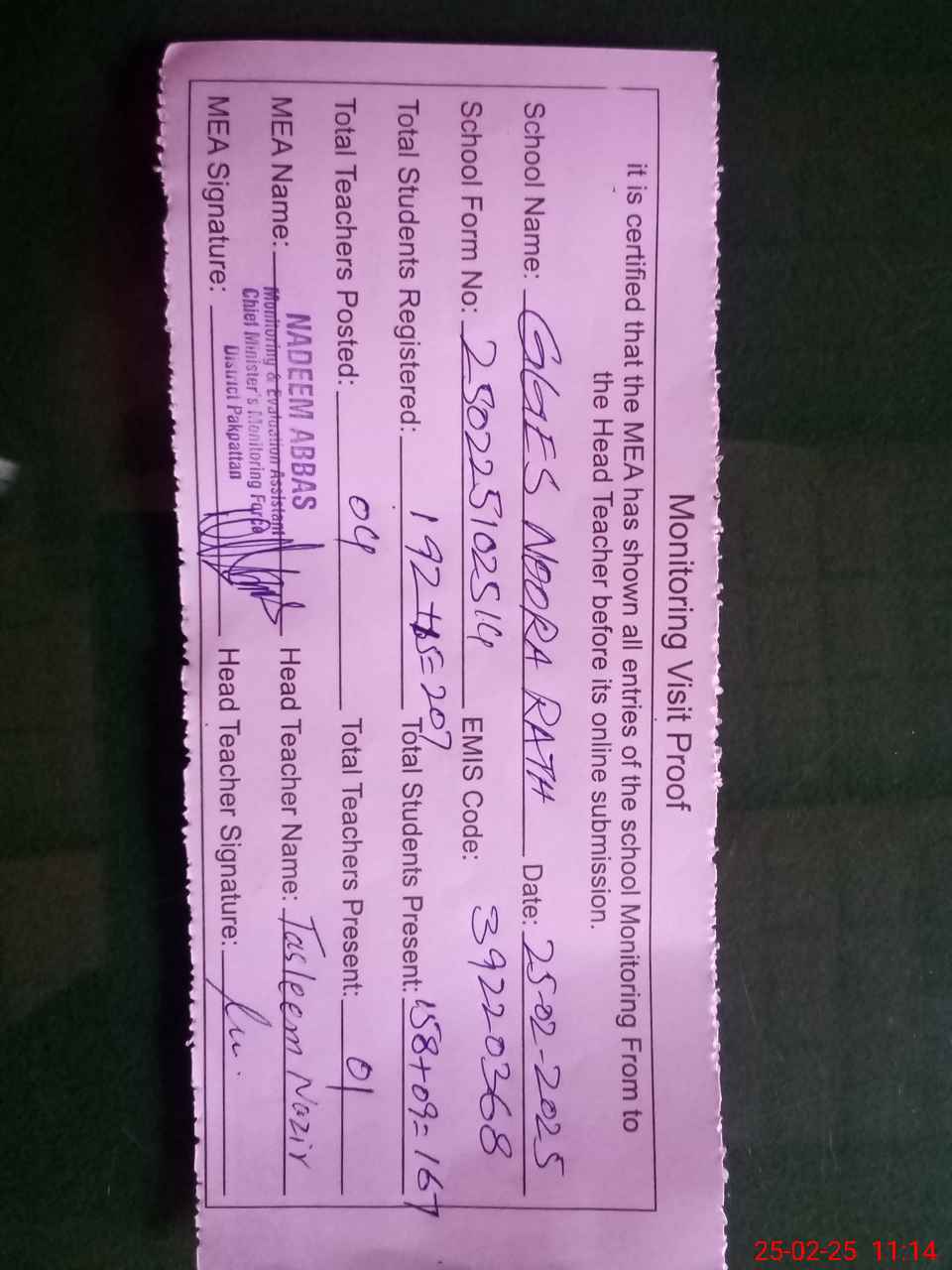 | EMIS Code: 39220368 | Name of School: GGES NOORA RATH NO.1 TEH.ARIFWALA | |||