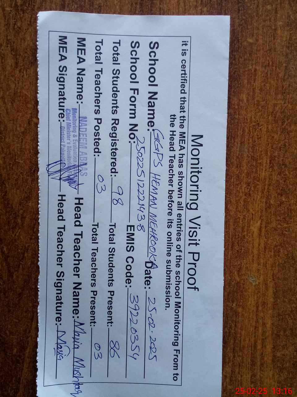| EMIS Code: 39220354 | Name of School: GGPS HEEMAN MEHROOKA | |||