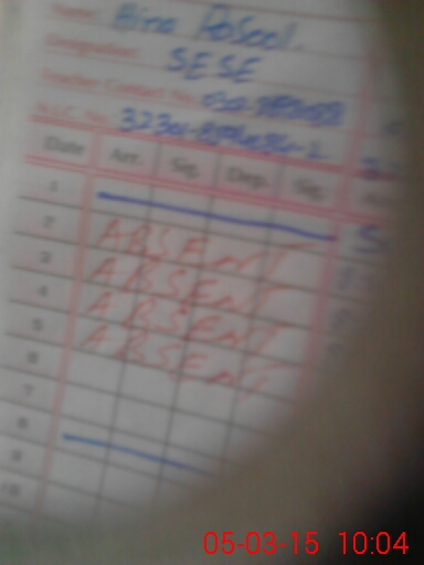 | Remarks (Use Separate Page if Required): Sir SeSe Sc Hina Rasool is AbSent from 2 March 15 and today She is Absent | |||||