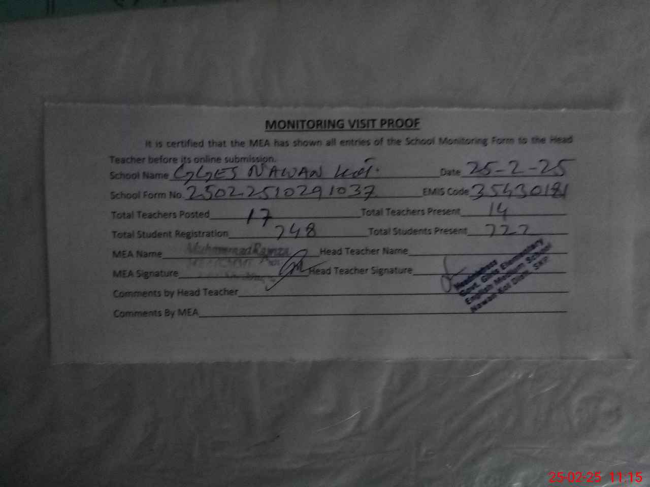 | Attendance Register | Head Teacher | MEA with School | Visit Proof |