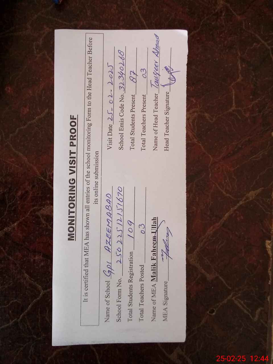 | Attendance Register | Head Teacher | MEA with School | Visit Proof |