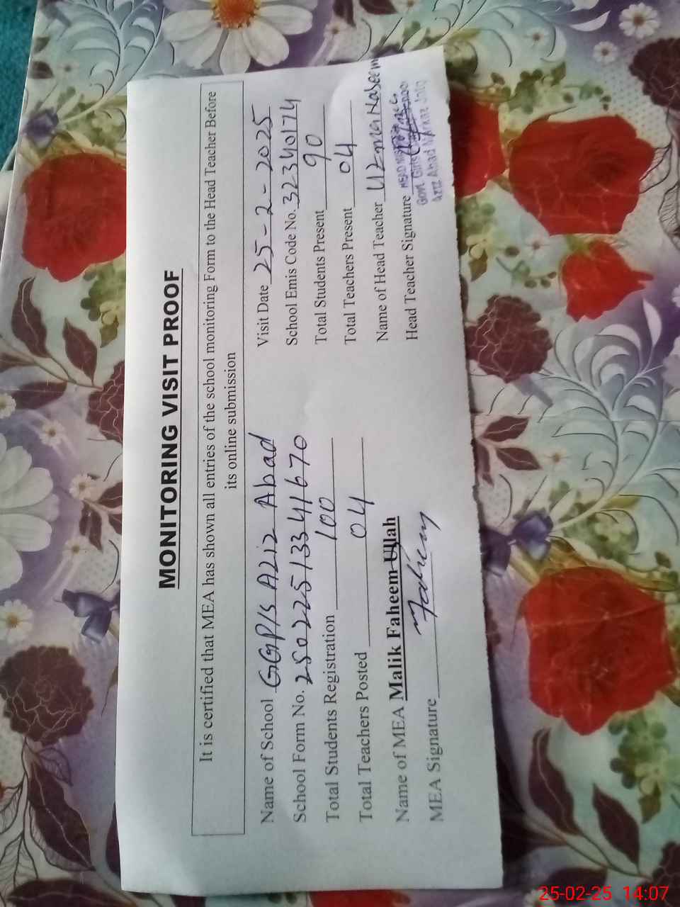 | Attendance Register | Head Teacher | MEA with School | Visit Proof |