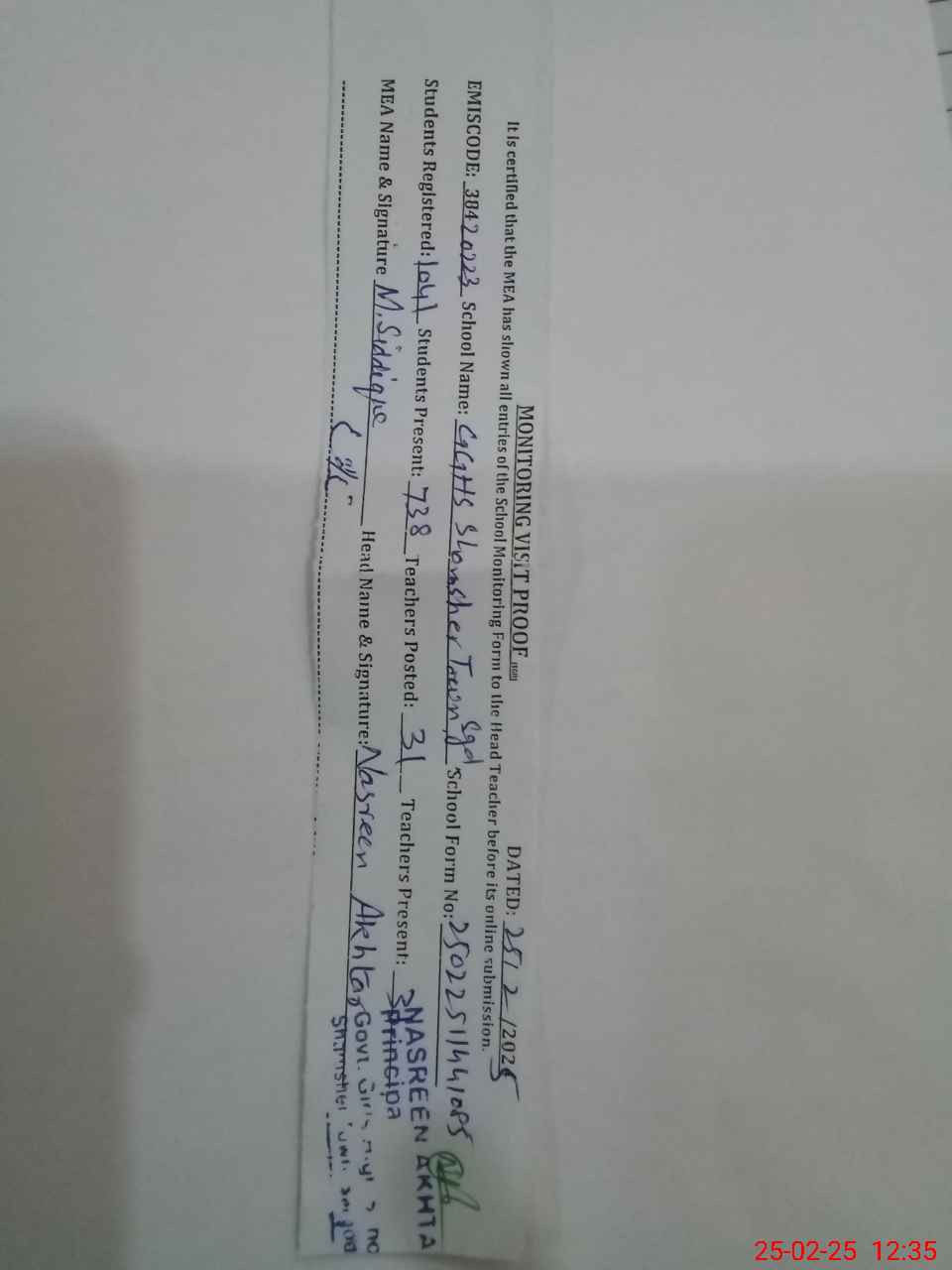 | Certified that this School was Inspected by the Undersigned MEA/DMO Today and the Information Stated Above is as Per Record. | |||||