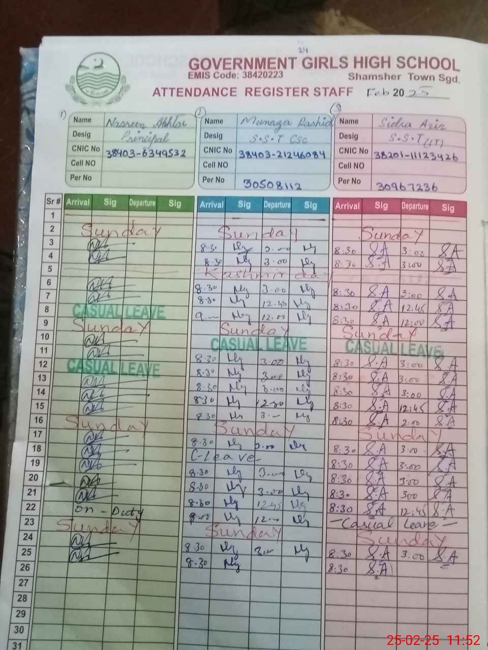| CNIC | Full Name | Designation | R/C | Absence during last cal. month |