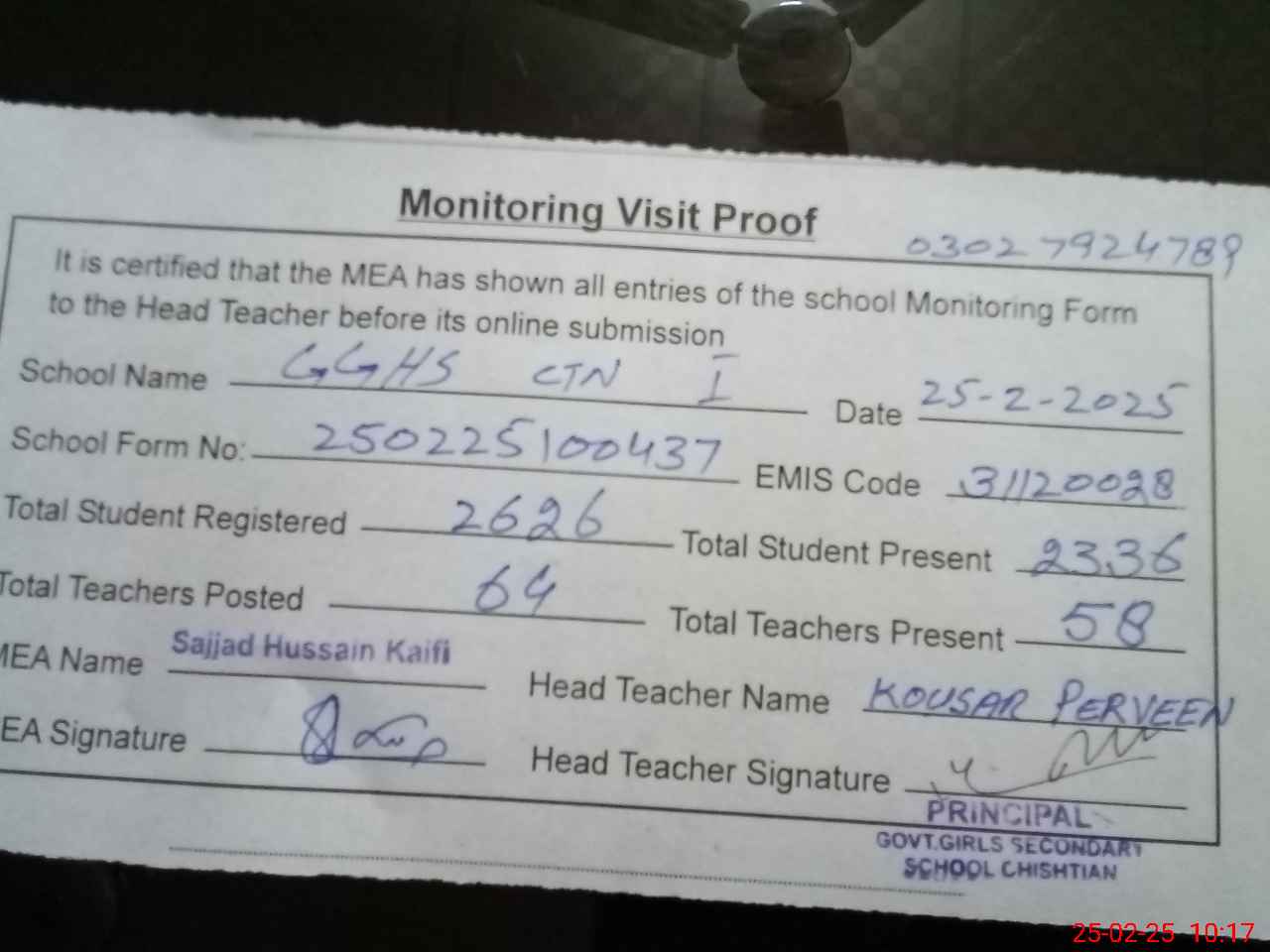 | Name: sh**** wa**** Designation: (School Headmaster's/Headmistress's) sst Phone/Cell Number: 03**** |