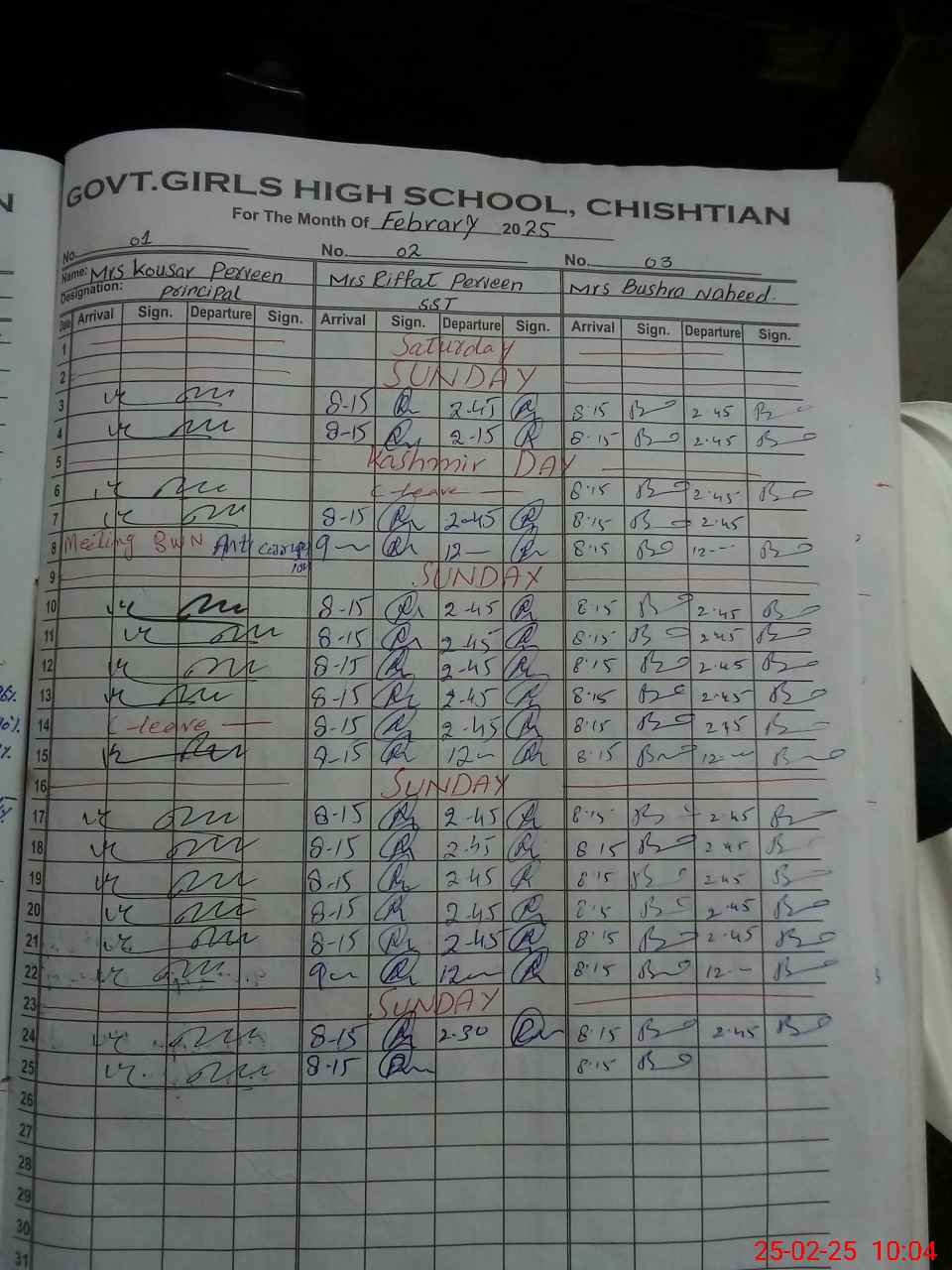 | CNIC | Full Name | Designation | R/C | Absence During Last Calender Month |