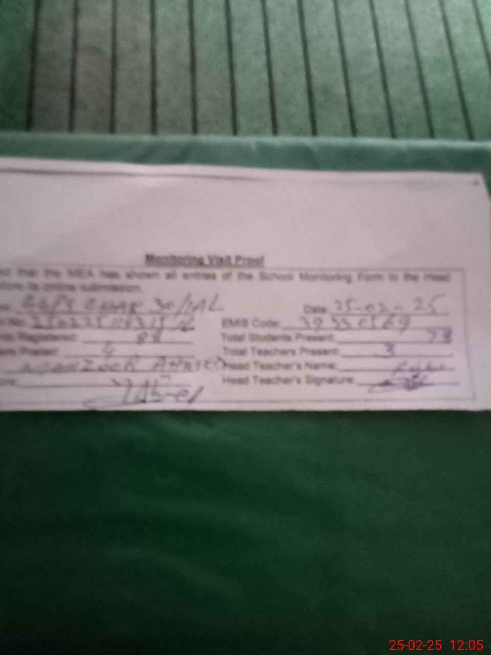 | Attendance Register | Head Teacher | MEA with School | Visit Proof |