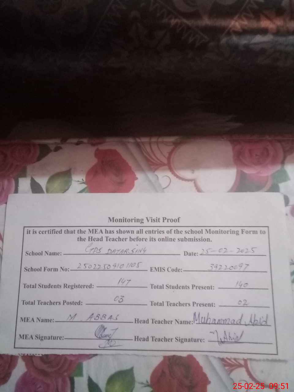 | EMIS Code: 39220097 | Name of School: GPS DATAR SINGH | |||
