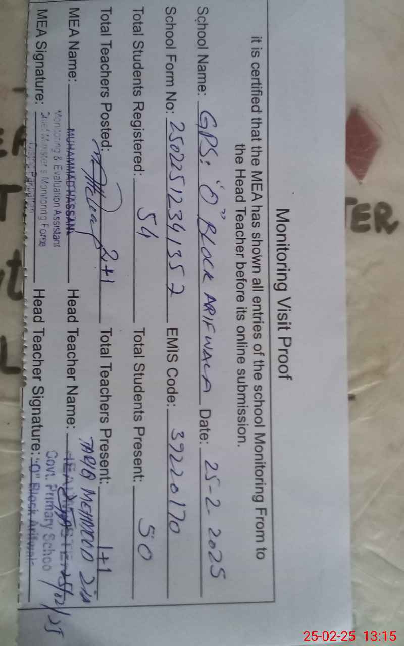 | EMIS Code: 39220170 | Name of School: GPS O BLOCK ARIFWALA | |||