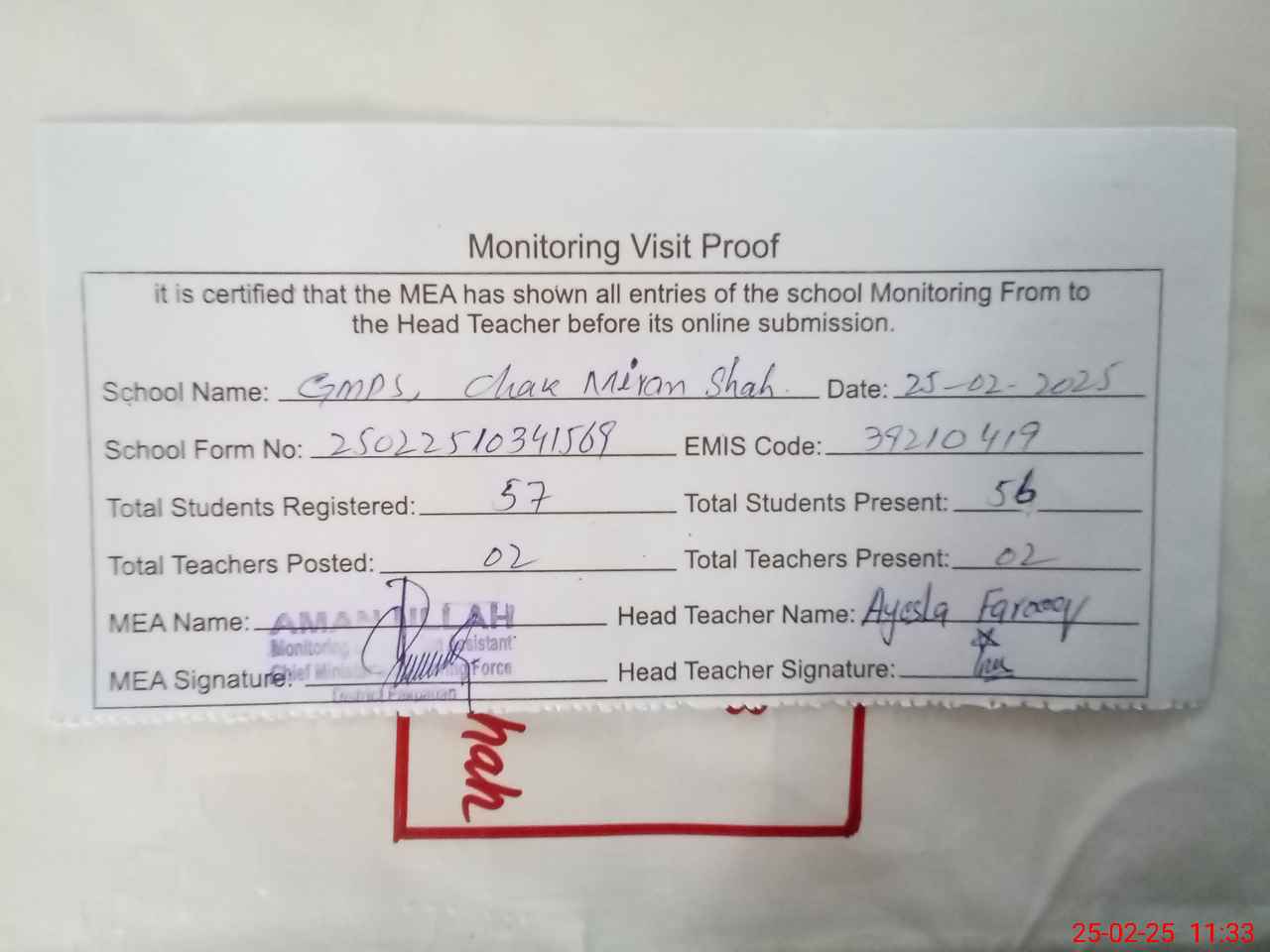 | Attendance Register | Head Teacher | MEA with School | Visit Proof |
