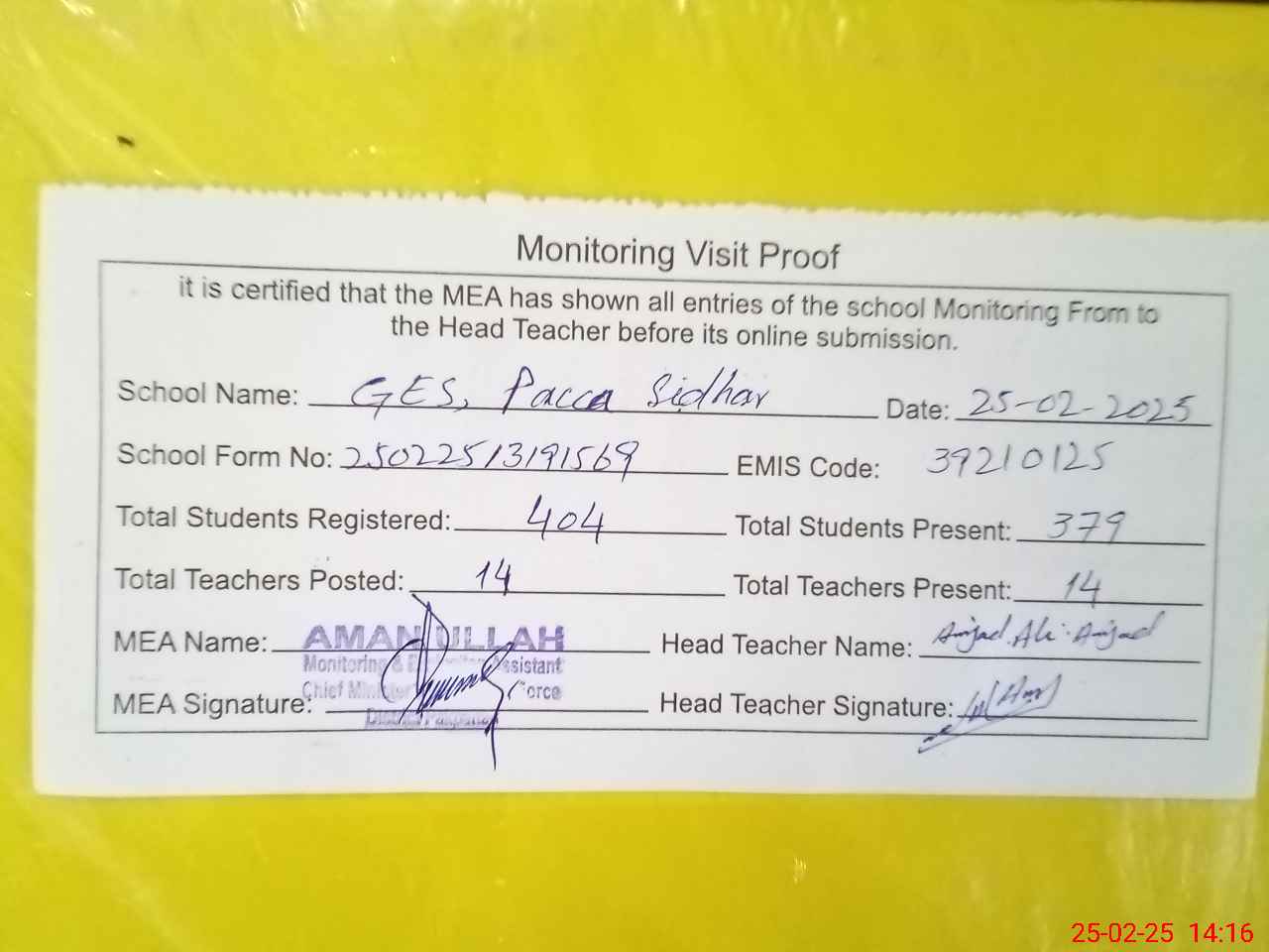 | Attendance Register | Head Teacher | MEA with School | Visit Proof |
