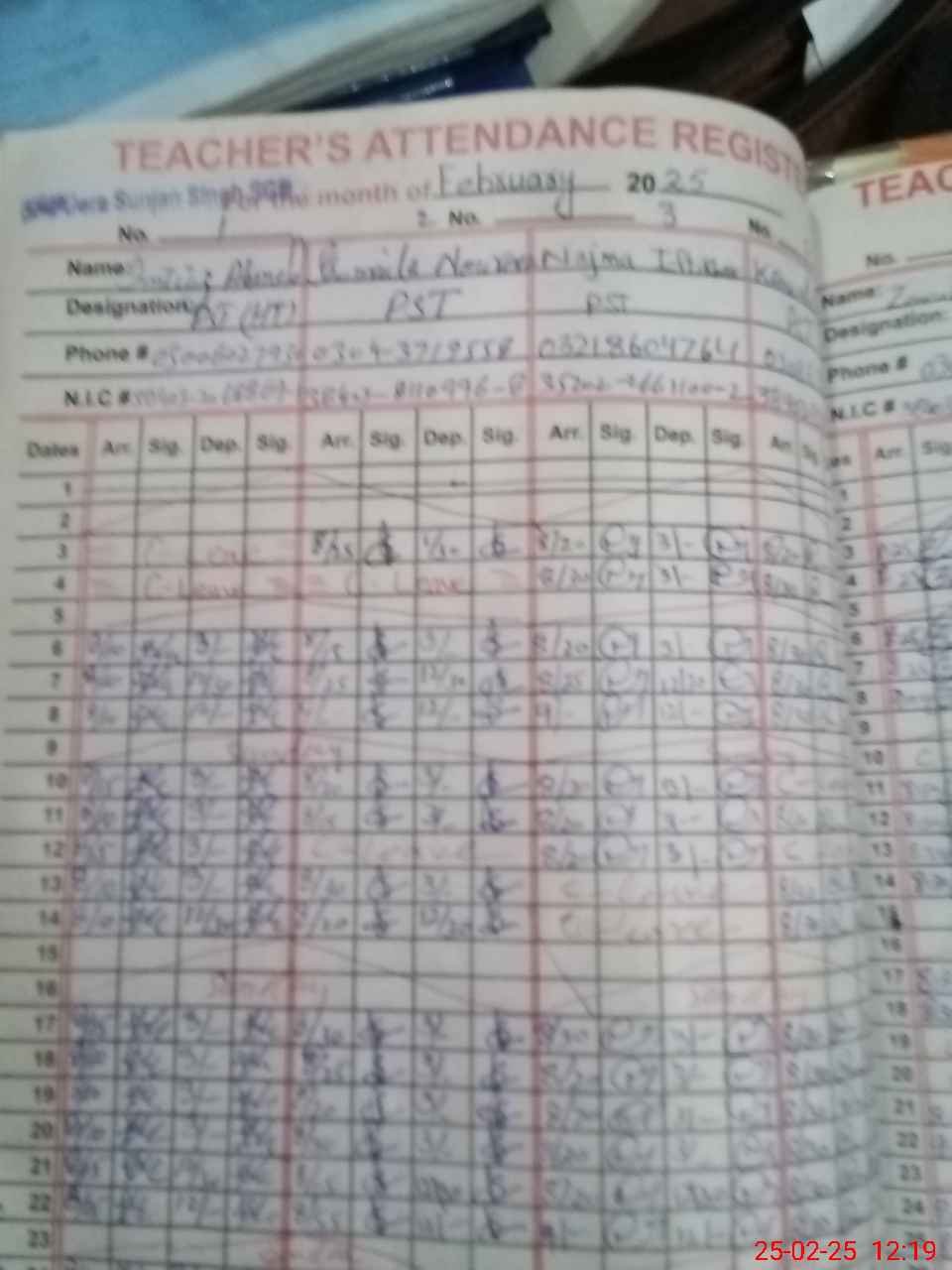 | CNIC | Full Name | Designation | R/C | Absence during last cal. month |