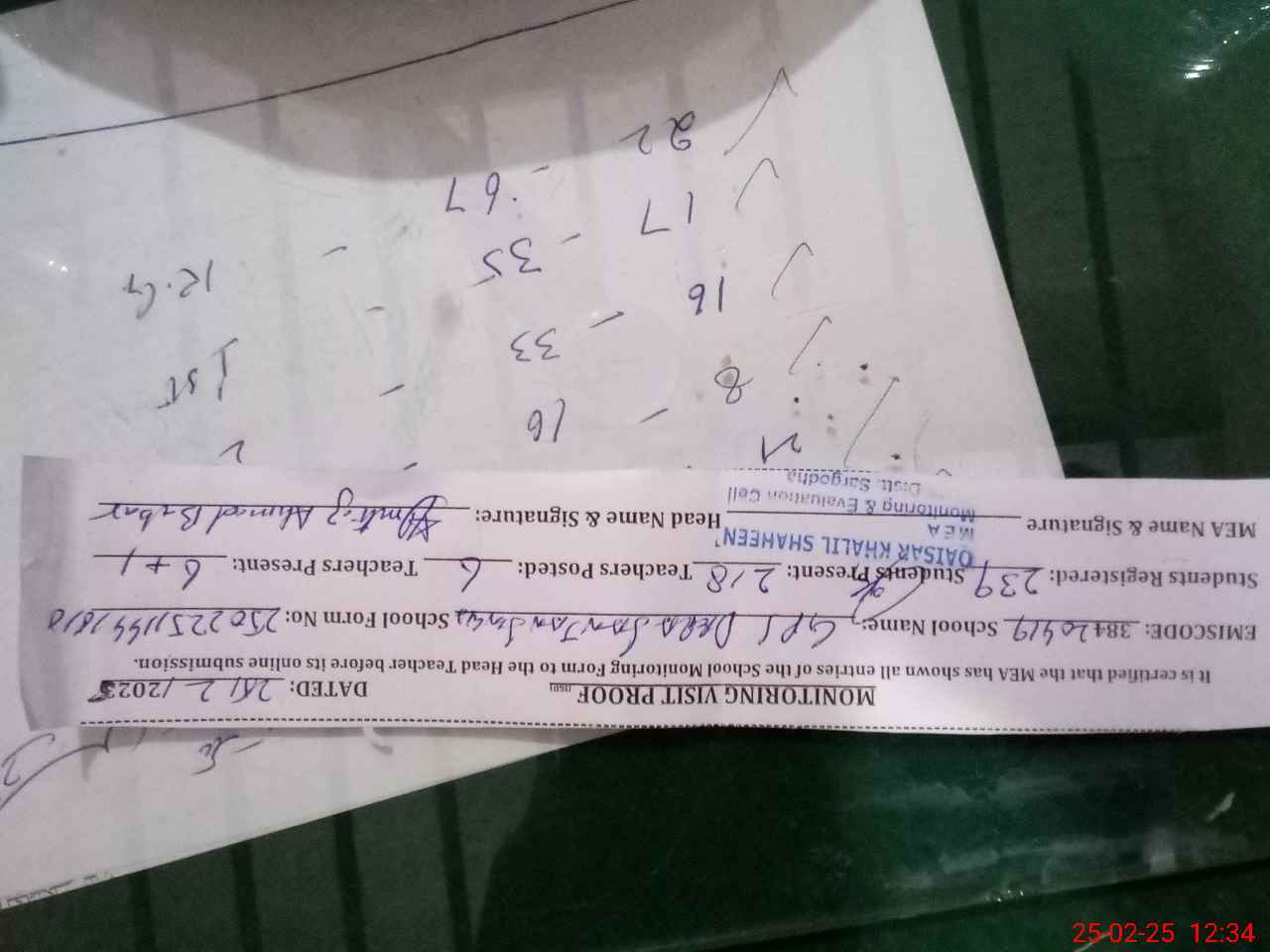 | Certified that this School was Inspected by the Undersigned MEA/DMO Today and the Information Stated Above is as Per Record. | |||||